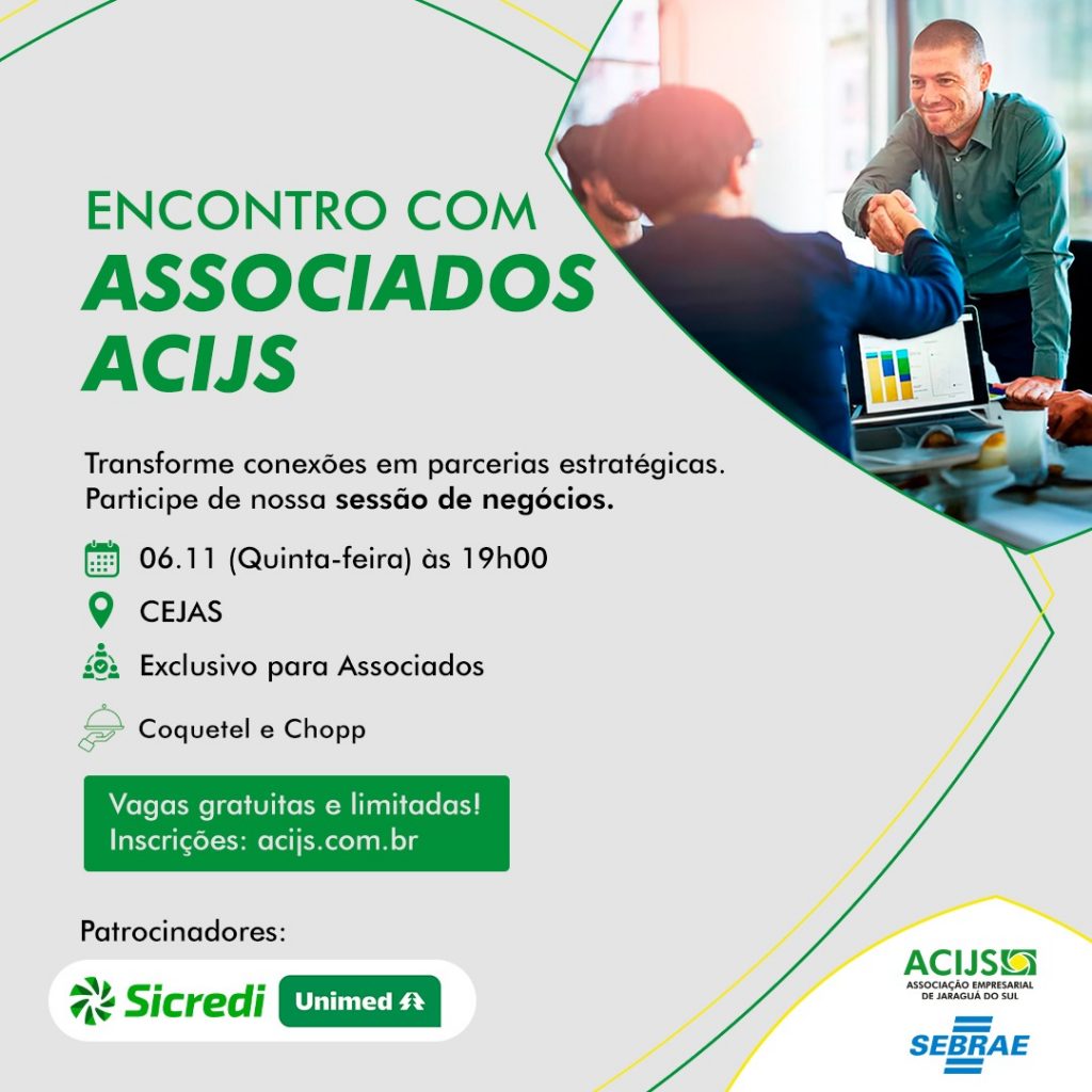 As vagas são limitadas e as inscrições devem ser confirmadas no link Encontro com Associados. Informações: telefone (47) 98835-1316 e no e-mail eventos@acijs.com.br.