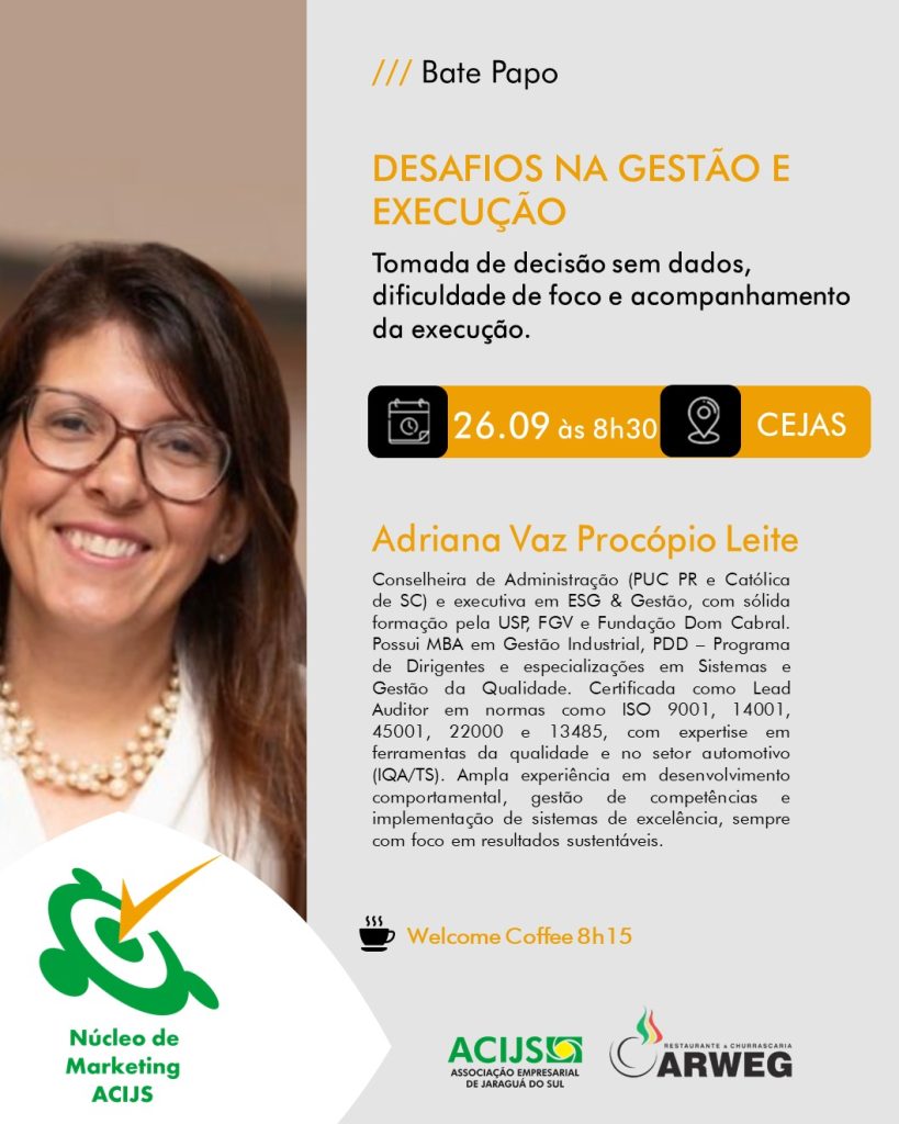 O Núcleo de Marketing realiza no dia 26 de setembro (sexta-feira) um bate-papo com o tema “Desafios na gestão e execução: Tomada de decisão sem dados, dificuldade de foco e acompanhamento da execução”, com a Conselheira de Administração e executiva em ESG & Gestão, Adriana Vaz Procópio Leite. Empresários e colaboradores de empresas interessados no tema estão convidados a participar.