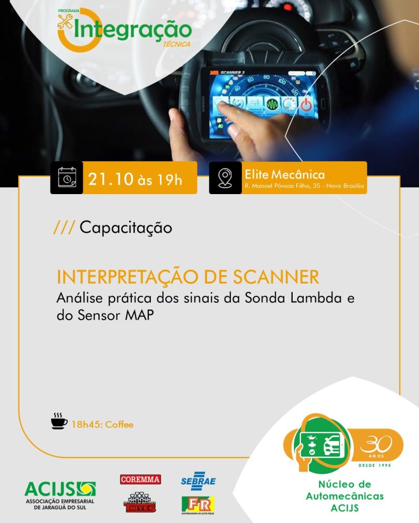 O Núcleo de Automecânicas realiza no dia 21 de outubro (terça-feira) a Capacitação “Interpretação de Scanner: Análise prática dos sinais da Sonda Lambda e do Sensor MAP”. A ação ocorre às 19h na Elite Mecânica, e é exclusiva para nucleados.