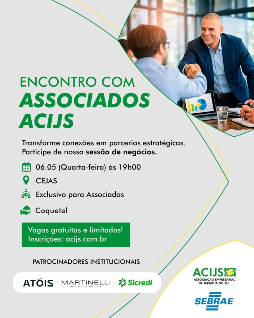 Participe do primeiro Encontro com Associados ACIJS do ano, que ocorrerá no dia 6 de maio (quarta-feira), às 19h, no Centro Empresarial de Jaraguá do Sul – CEJAS. A ação é gratuita e exclusiva para associados.