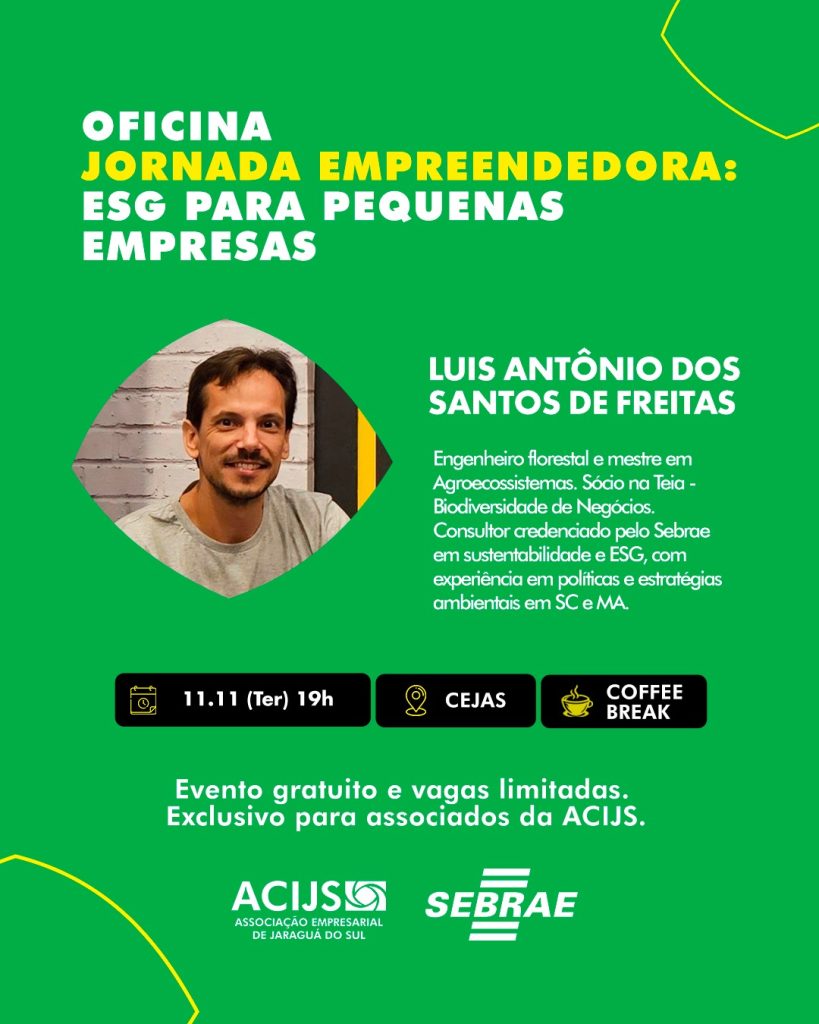 Para falar sobre o assunto, vamos receber o consultor Luis Antônio dos Santos de Freitas, responsável por diversos programas sobre ESG no Sebrae. O evento é gratuito e exclusivo para associados e ocorre em 11 de novembro (terça), às 19h, no Centro Empresarial de Jaraguá do Sul – CEJAS.