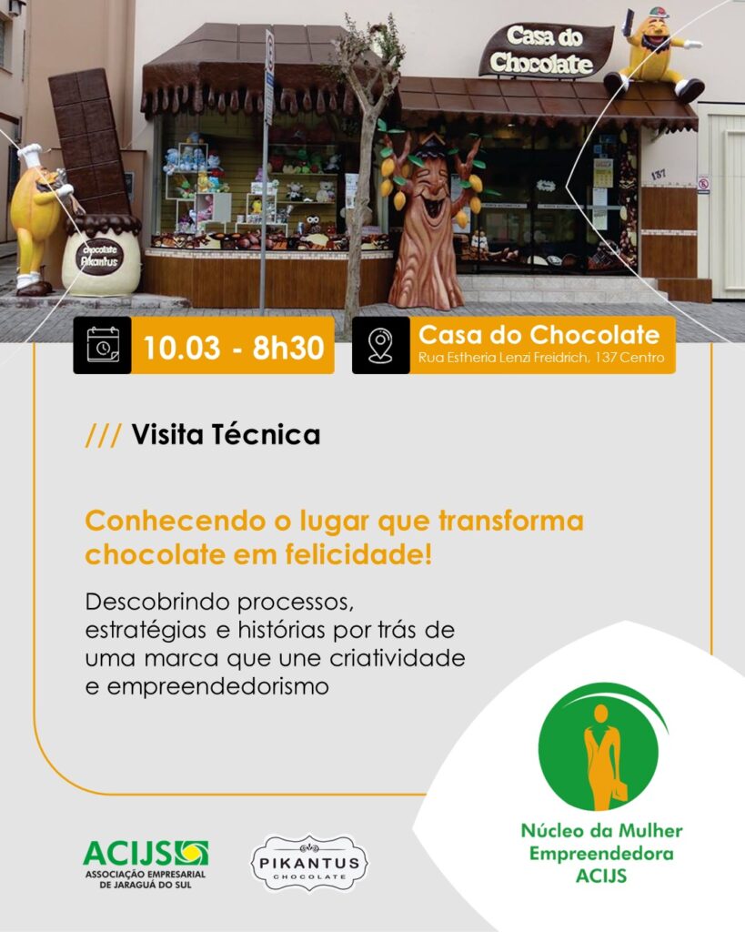 O Núcleo da Mulher Empreendedora ACIJS realiza no dia 10 de março (terça-feira) às 8h30, uma visita técnica na Casa do Chocolate, o lugar que transforma chocolate em felicidade. O objetivo da ação é conhecer de perto etapas da produção, trocar experiências, fortalecer o networking e ampliar a visão empreendedora.