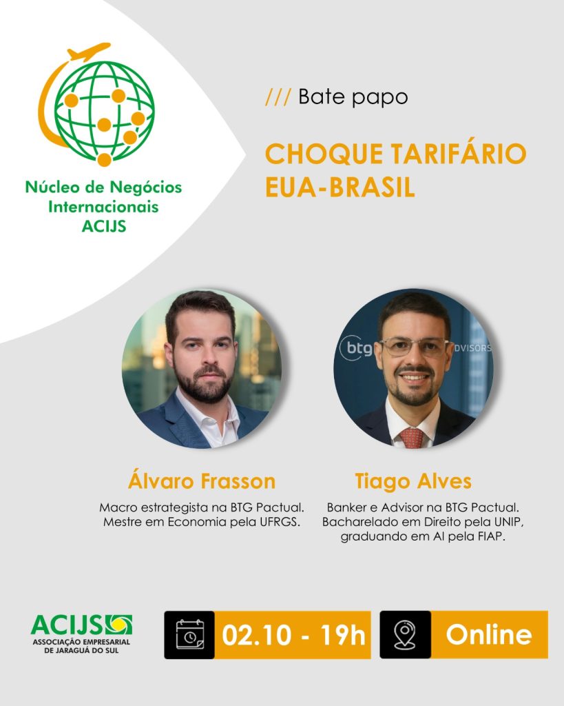 O Núcleo de Negócios Internacionais realiza no dia 02 de outubro (quinta-feira) o bate-papo “Choque Tarifário EUA – BRASIL”, com o Macro estrategista na BTG Pactual, Álvaro Frasson e o Banker e Advisor na BTG Pactual, Tiago Alves.