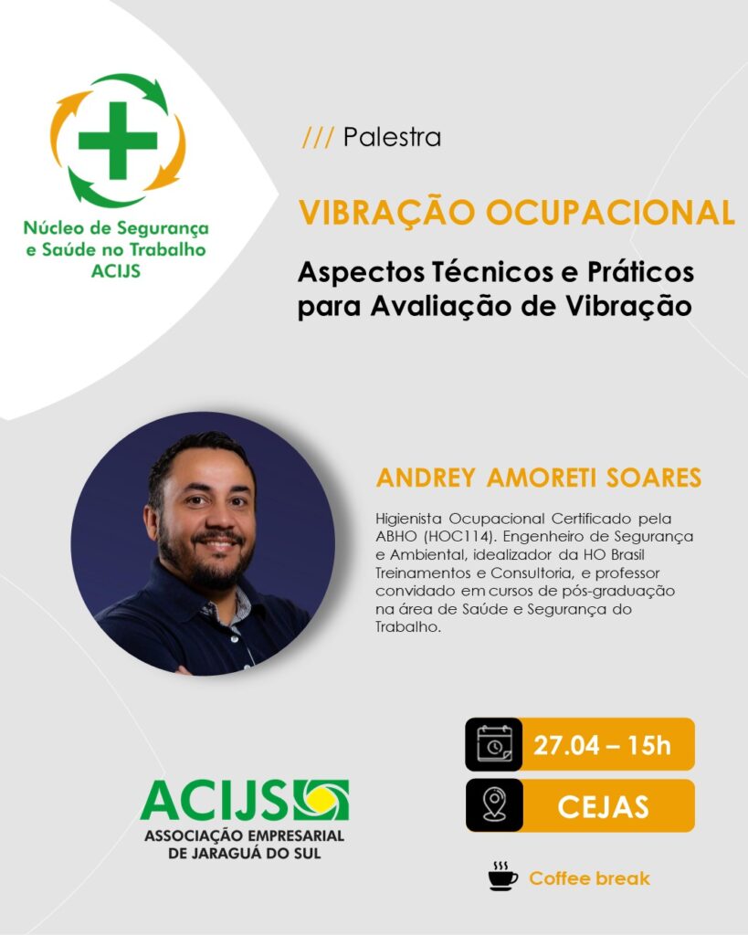 O Núcleo de Segurança e Saúde no Trabalho ACIJS realiza uma palestra com o tema “Vibração ocupacional: Aspectos técnicos e práticos para avaliação de vibração”, com o Engenheiro de Segurança e Ambiental, Andrey Amoreti Soares. No encontro serão abordados desde os conceitos técnicos até a aplicação prática na identificação, medição e controle desse importante agente de risco.