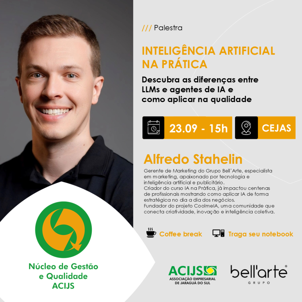 O Núcleo de Gestão e Qualidade realiza no dia 23 de setembro (terça-feira) a palestra “Inteligência artificial na prática: descubra as diferenças entre LLMs e agentes de IA e como aplicar na qualidade”, com o gerente de marketing do grupo Bell’Arte, Alfredo Stahelin.