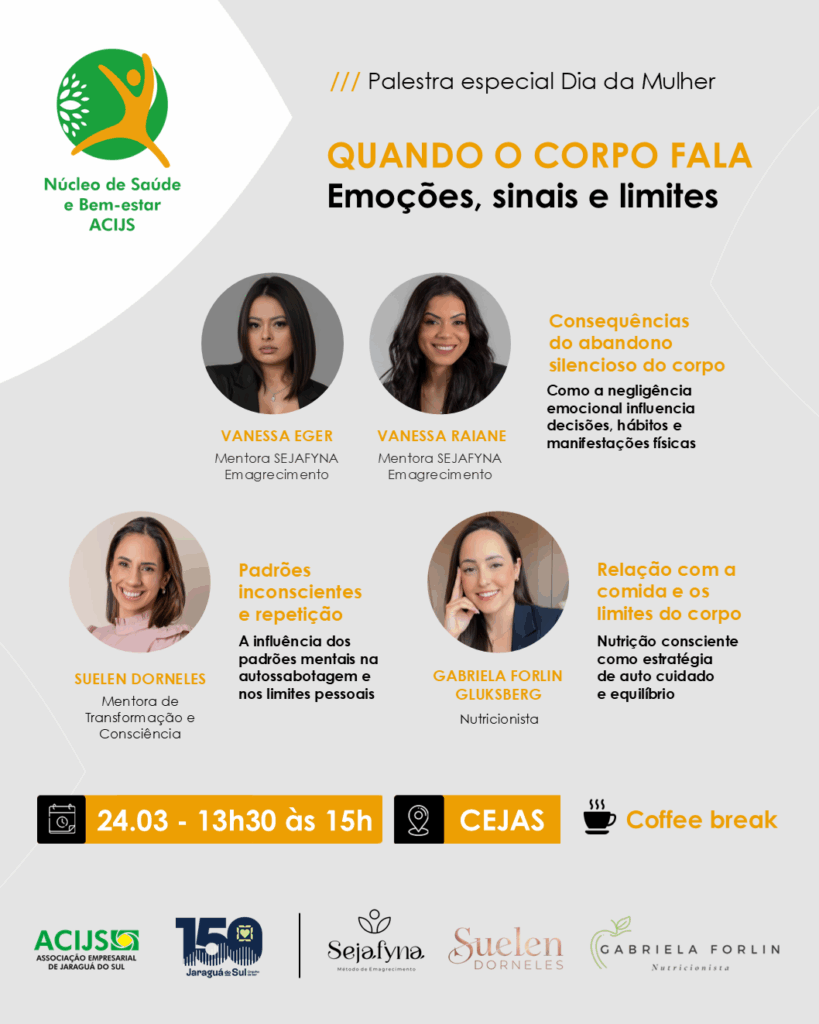 A ação será conduzida por Vanessa Raiane e Vanessa Eger, mentoras da SEJAFYNA Emagrecimento, Suelen Dorneles, mentora de Transformação e Consciência, e Gabriela Forlin, nutricionista. As painelistas abordarão os sinais do corpo, o impacto das emoções na saúde e a importância de reconhecer e respeitar os próprios limites.