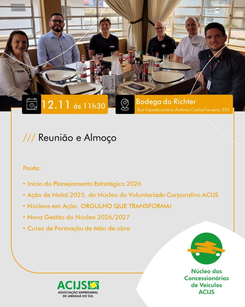 O Núcleo das Concessionárias de Veículos ACIJS realiza seu próximo encontro em 12 de novembro (quarta-feira), às 11h30, em uma reunião na Bodega do Richter. O encontro é exclusivo para nucleados.