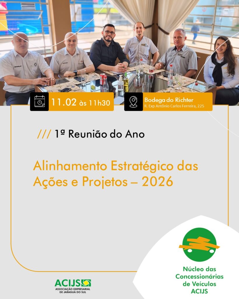 O Núcleo das Concessionárias de Veículos ACIJS inicia 2026 com uma reunião de alinhamento estratégico das ações e projetos para o ano, no dia 12 de fevereiro (quinta-feira), às 8h, na Bodega do Richter.