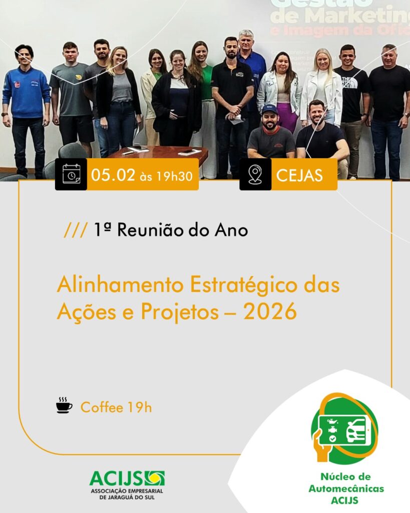O Núcleo de Automecânicas ACIJS inicia 2026 com uma reunião de alinhamento estratégico das ações e projetos para o ano. O encontro ocorre no dia 05 de fevereiro (quinta-feira), às 19h30, no CEJAS, e é exclusivo para nucleados.