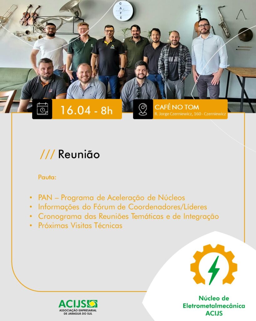 O Núcleo de Eletrometalmecânica ACIJS realiza uma reunião de alinhamento das ações no dia 16 de abril (quinta-feira), às 8h, no Café no Tom.