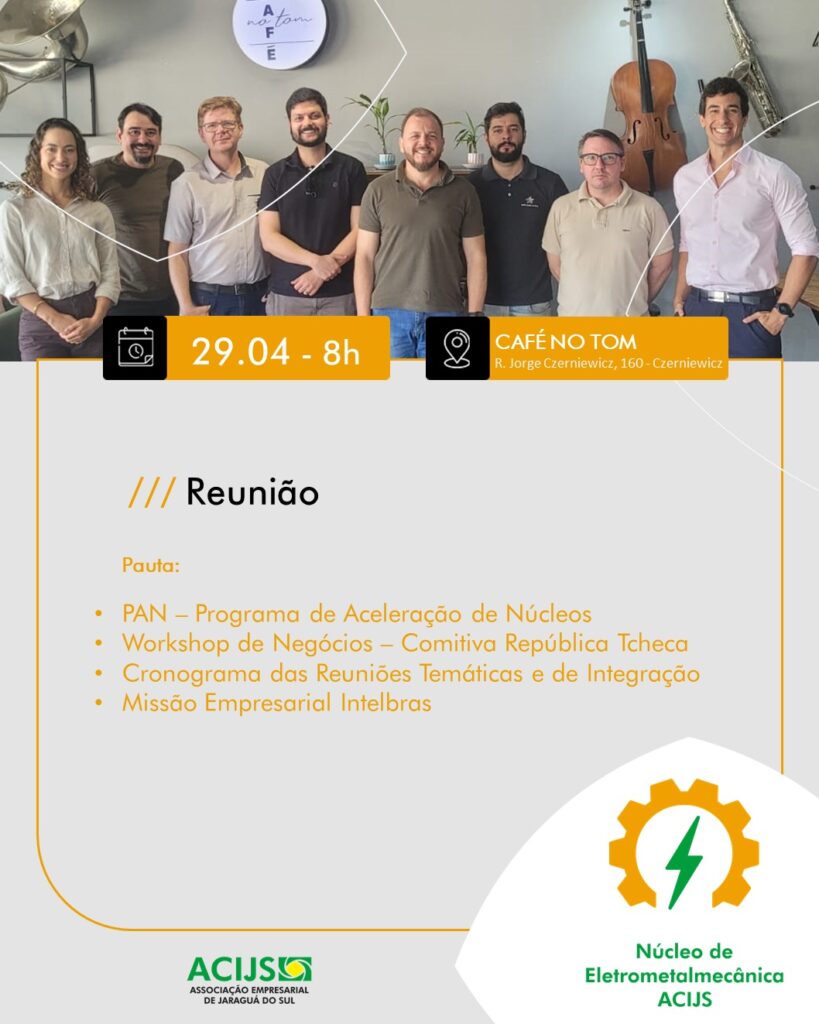 O Núcleo de Eletrometalmecânica ACIJS realiza uma reunião de alinhamento das ações no dia 29 de abril (quarta-feira), às 8h, no Café no Tom.