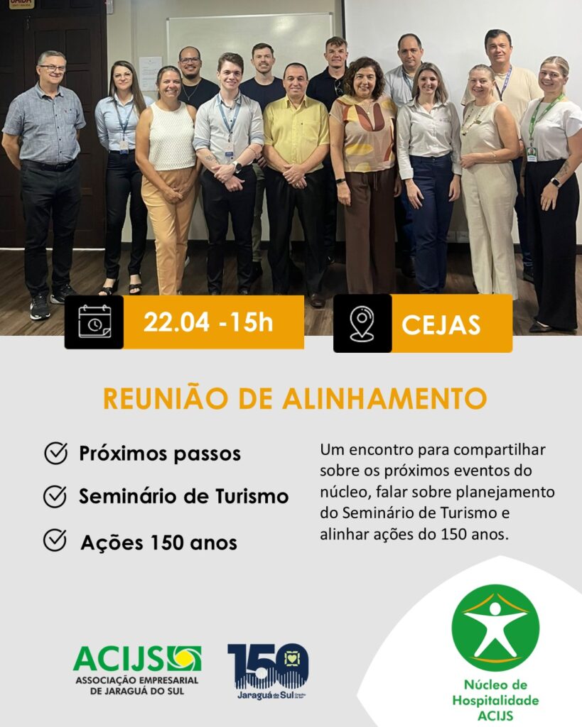 O Núcleo de Hospitalidade ACIJS realiza uma reunião de alinhamento das próximas ações no dia 22 de abril (quarta-feira), às 15h, no Centro Empresarial de Jaraguá do Sul – CEJAS.