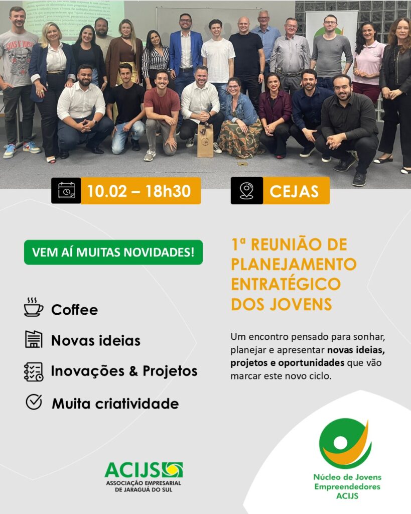 O Núcleo de Jovens Empreendedores ACIJS inicia 2026 com um café de boas-vindas e uma reunião de planejamento estratégico no dia 10 de fevereiro (terça-feira), às 18h30, no CEJAS.