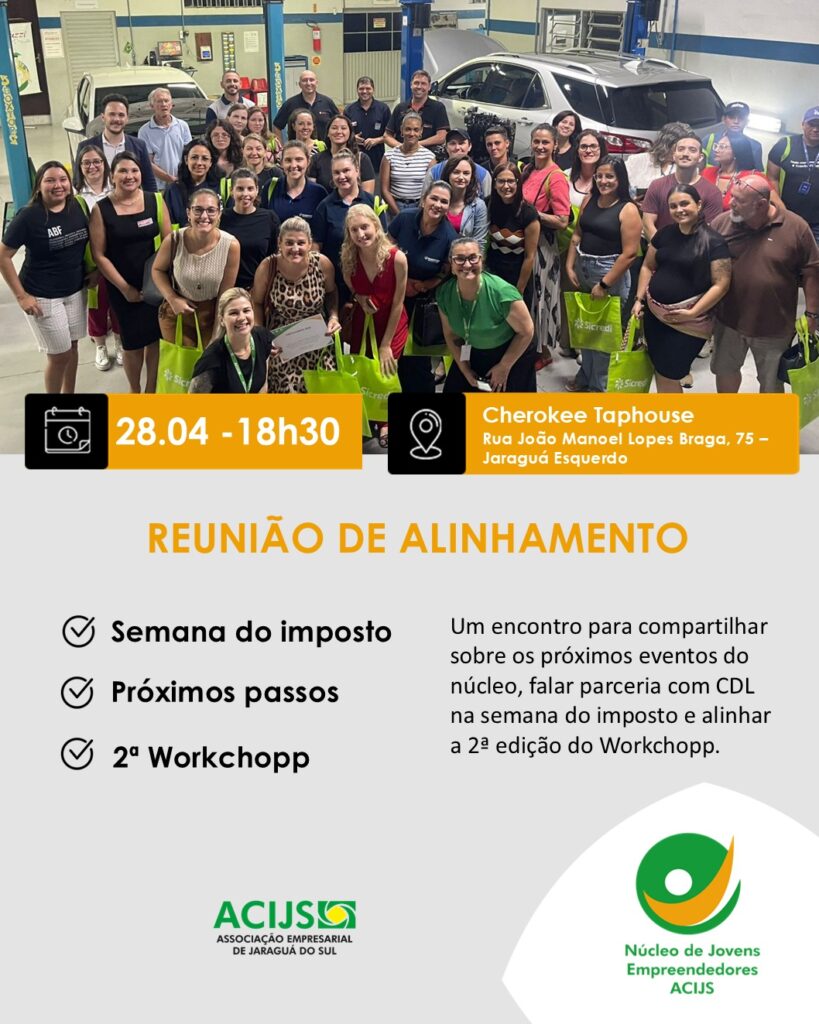 O Núcleo de Jovens Empreendedores ACIJS realiza uma reunião de alinhamento das próximas ações no dia 28 de abril (terça-feira), às 18h30, na Cherokee Tap House.