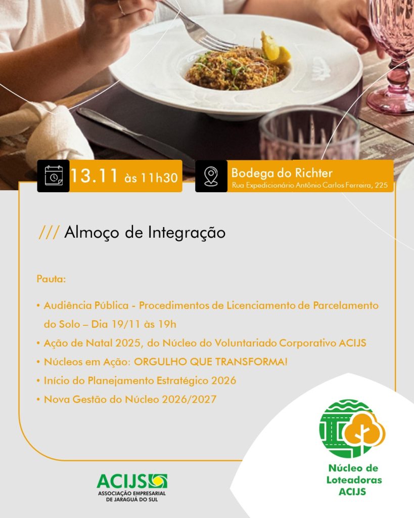 O Núcleo de Loteadoras ACIJS realiza seu próximo encontro em 13 de novembro (quinta-feira), às 11h30, em uma reunião na Bodega do Richter. O encontro é exclusivo para nucleados.