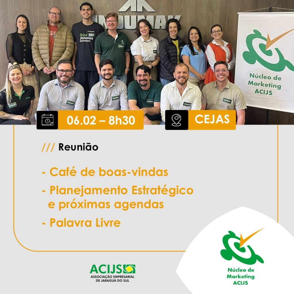 O Núcleo de Marketing ACIJS inicia 2026 com um café de boas-vindas no dia 06 de fevereiro (sexta-feira), às 8h30, no CEJAS. Na reunião, será discutido o planejamento estratégico do grupo, além da apresentação do cronograma das próximas agendas.