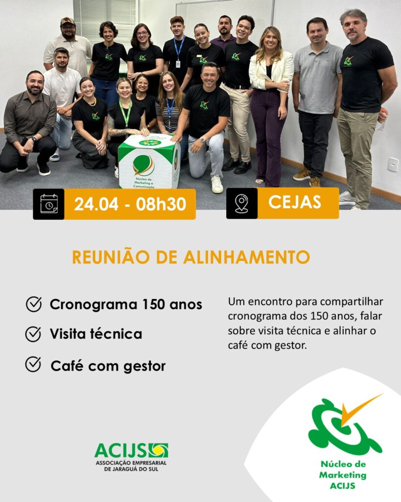 O Núcleo de Marketing ACIJS realiza uma reunião de alinhamento das próximas ações no dia 24 de abril (sexta-feira), às 8h30, no Centro Empresarial de Jaraguá do Sul – CEJAS.
