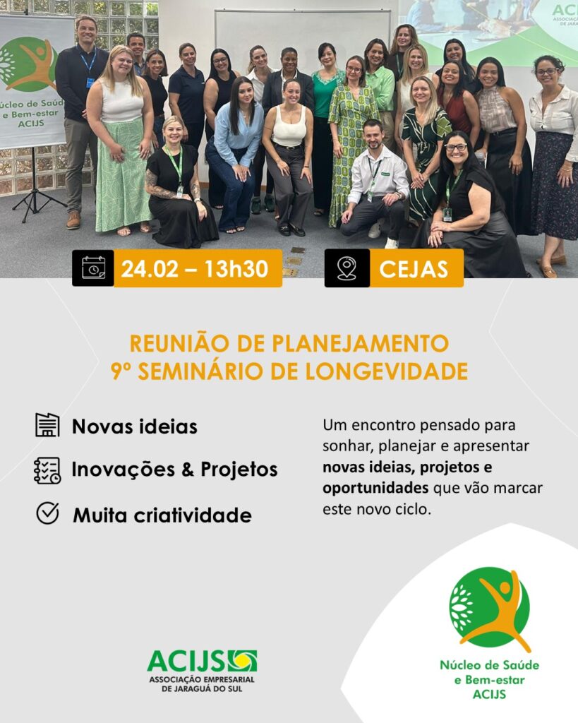 O Núcleo de Saúde e Bem-estar ACIJS realiza uma reunião de planejamento do 9º Seminário de Longevidade no dia 24 de fevereiro (terça-feira), às 13h30, no Centro Empresarial de Jaraguá do Sul – CEJAS.