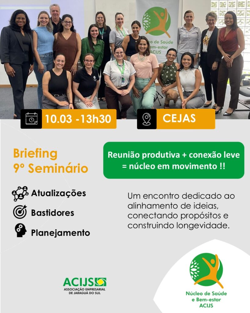 O Núcleo de Saúde e Bem-estar ACIJS realiza uma reunião de planejamento da próxima edição do Seminário de Longevidade. O encontro acontece no dia 10 de março (terça-feira), às 13h30, no CEJAS.