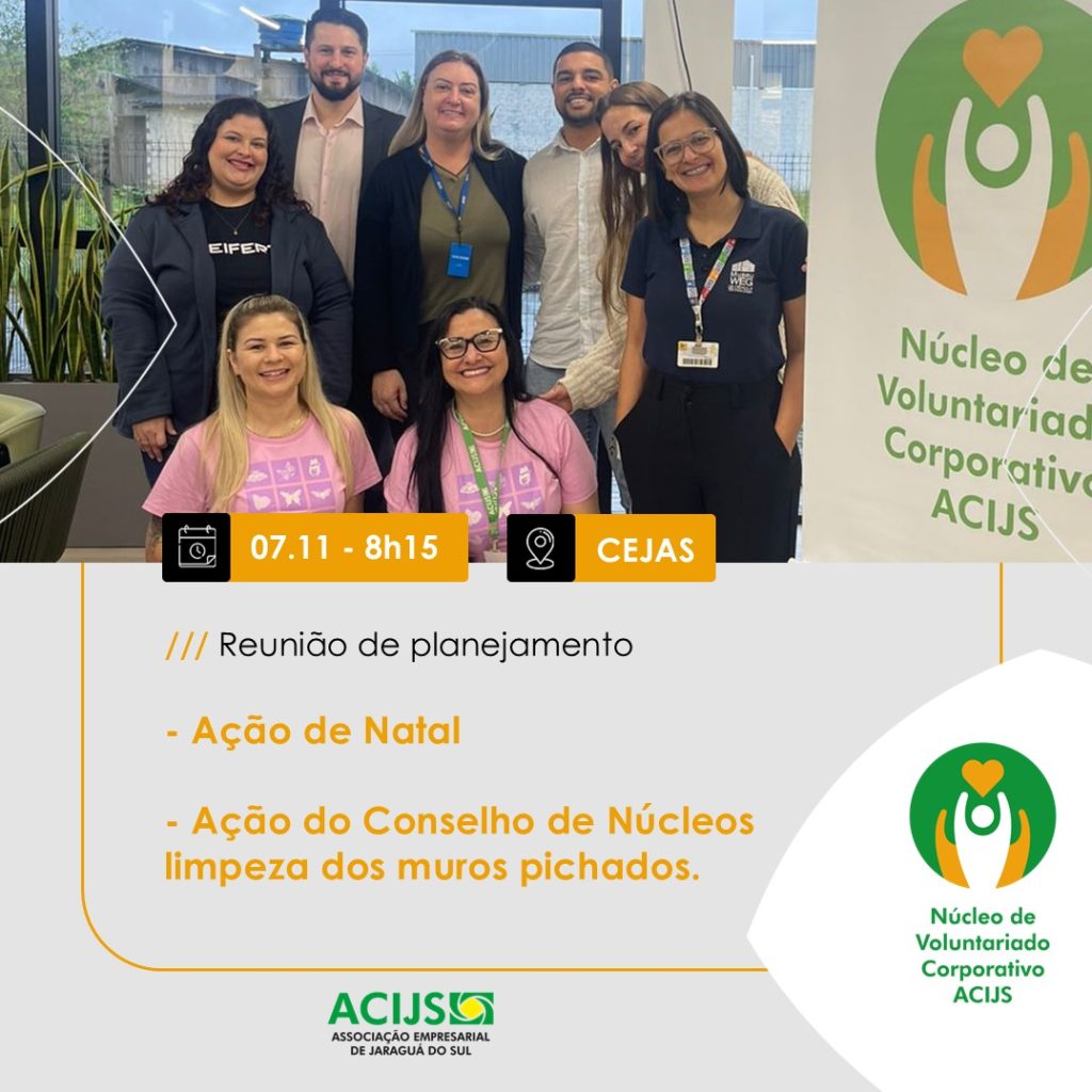 O Núcleo de Voluntariado Corporativo ACIJS realiza seu próximo encontro no dia 07 de novembro (sexta-feira), às 8h15, em uma reunião no CEJAS. Empresários e colaboradores de empresas interessados em conhecer o núcleo estão convidados a participar.