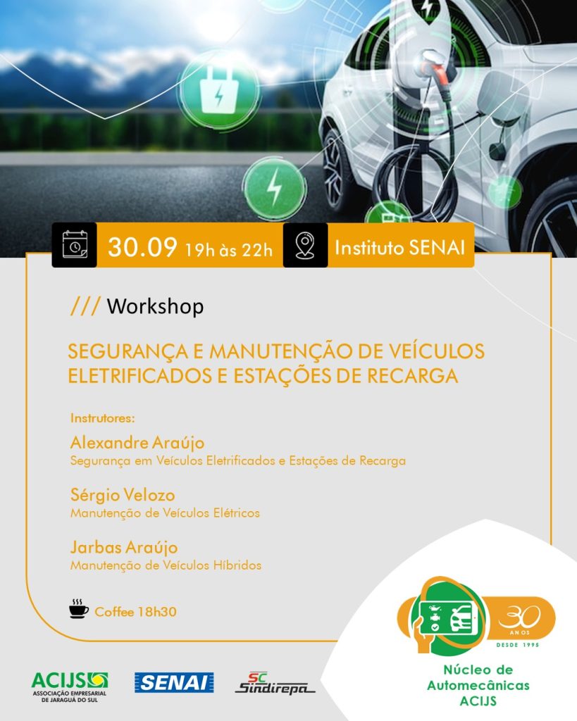 Uma das próximas etapas do trabalho de capacitação das empresas nucleadas ocorre no dia 30 (terça-feira) em parceria com o Instituto SENAI de Tecnologia. Exclusivamente para as empresas ligadas ao Núcleo da ACIJS, o workshop “Segurança e manutenção de veículos eletrificados e estações de recarga”, quer demonstrar como os profissionais podem se preparar para o crescimento nas demandas de serviços e atuando com segurança e competência nesta nova era da mobilidade.