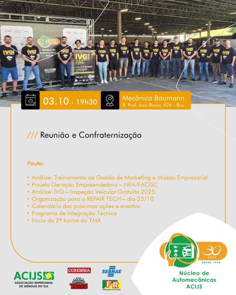 Também no dia 3, o Núcleo de Automecânicas realiza reunião de alinhamento e confraternização, às 19h30, na Mecânica Baumann. A atividade é exclusiva para empresas nucleadas.