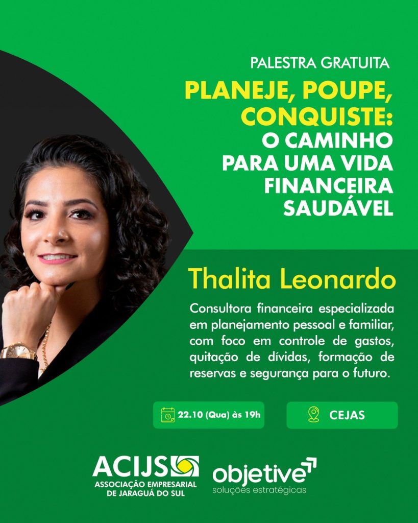 No dia 22 de outubro, a ACIJS volta a abrir espaço para que seus associados compartilhem suas experiências e cases de sucesso. Desta vez a convidada da Jornada Empreendedora é Thalita Leonardo, da Objetive Soluções Estratégicas, que irá ministrar a palestra ‘Planeje, poupe, conquiste: o caminho para uma vida’, de forma gratuita. O evento ocorrerá às 19h, no CEJAS. A palestra vai tratar sobre os princípios essenciais do controle e planejamento financeiro pessoal e familiar. Estratégias práticas para organizar suas finanças, evitar dívidas desnecessárias, construir uma reserva financeira e planejamento para objetivos de curto, médio e longo prazo.