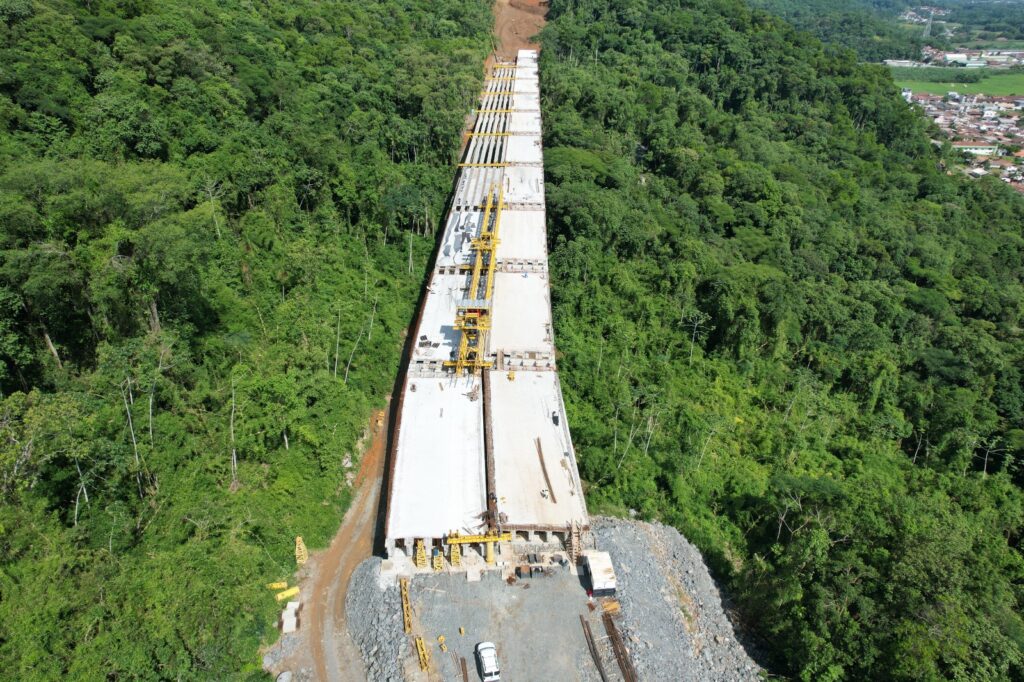 O Departamento Nacional de Infraestrutura de Transportes (DNIT) divulgou uma nova atualização sobre o avanço das obras de duplicação da BR‑280, em Santa Catarina. Segundo o órgão, os trabalhos seguem em ritmo constante nos elevados de acesso ao túnel de Jaraguá do Sul, localizados nos quilômetros 64,9 e 65,4 da rodovia. As estruturas, que integram o lote 2.2, estão na fase de lançamento de vigas.