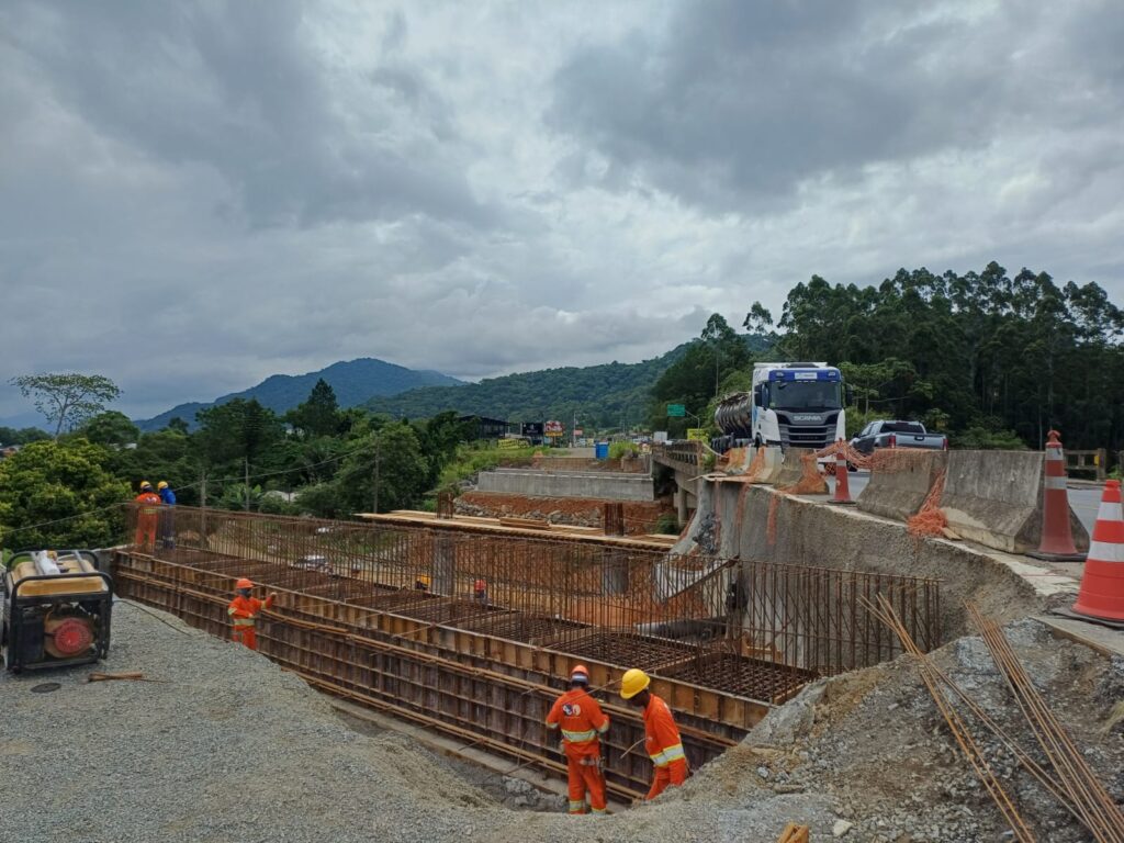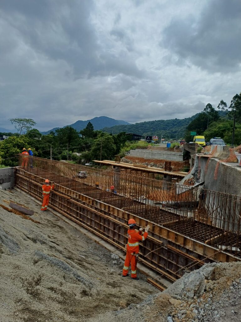 O estágio atual dos trabalhos inclui a complementação da terra-armada na cabeceira do viaduto no sentido Guaramirim–BR-101, além da finalização da barreira tipo “New Jersey” — que separa as pistas — e da calçada com faixa compartilhada para ciclistas e pedestres. Também estão sendo concluídas as concretagens das vigas travessas, que receberão as vigas longarinas e a pré-laje, já fabricadas e armazenadas em área próxima ao local. Na sequência, será realizada a pavimentação da travessia.