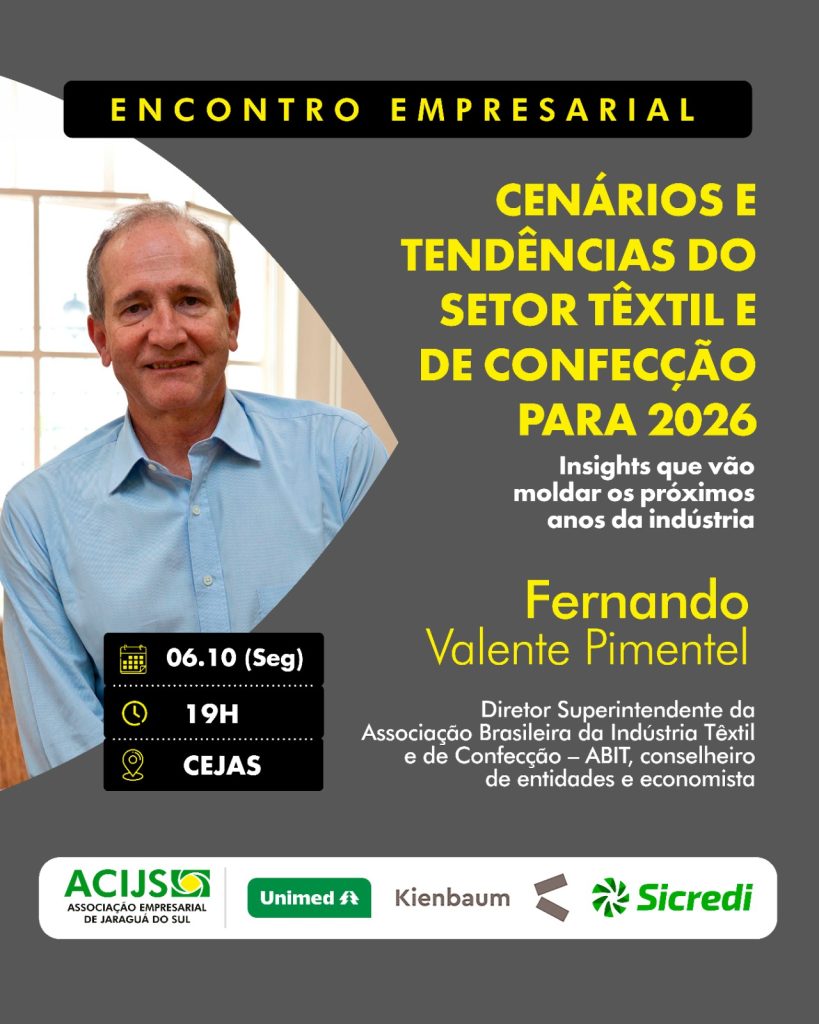 Uma das mais influentes lideranças da cadeia têxtil do Brasil, o economista Fernando Valente Pimentel estará em Jaraguá do Sul no dia 6, segunda-feira.