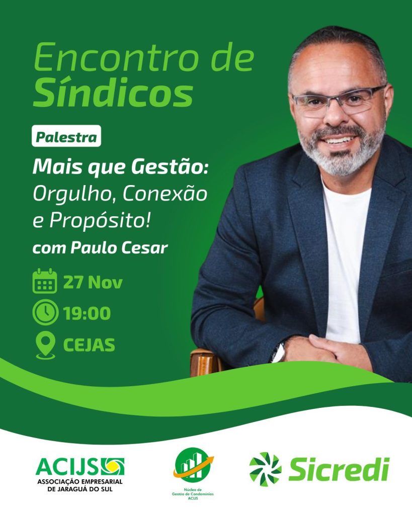 Em novembro, o Núcleo de Gestão de Condomínios, em parceria com a Sicredi, realiza no dia 27 o evento Encontro de Síndicos que contará com uma palestra com o tema “Mais que Gestão: Orgulho, Conexão e Propósito!”. O encontro será conduzido por Paulo Cesar, administrador com MBA em Gestão de Negócios, mestrado em Planejamento e Certificado como Síndico 5 Estrelas pela Fundação Vanzolini. O evento ocorre às 19h no CEJAS e as inscrições são gratuitas. Empresários e colaboradores de empresas interessados no tema estão convidados a participar.