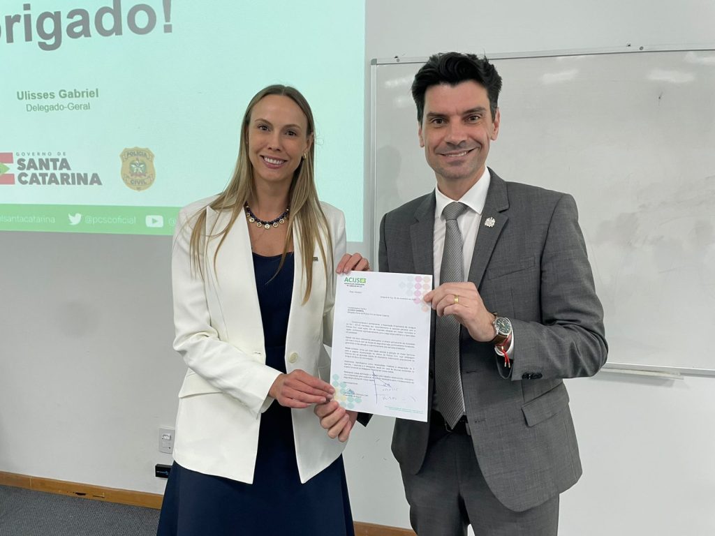 Ulisses Gabriel também apresentou um panorama da atuação da Polícia Civil em Santa Catarina, destacando avanços em infraestrutura, aquisição de viaturas, uso de tecnologia e aprimoramento da inteligência operacional.