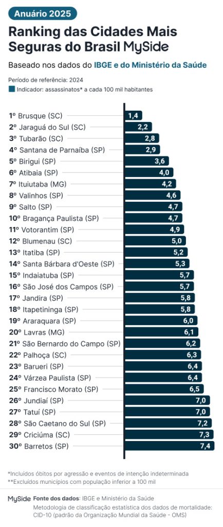 O Anuário indicou que Jaraguá do Sul registrou 2,2 homicídios por 100 mil habitantes, enquanto Brusque tem 1,4. Tubarão ficou em terceiro com 2,8. O estudo considera dados oficiais de criminalidade e indicadores de violência urbana, evidenciando a liderança de Santa Catarina no ranking nacional de cidades mais seguras.