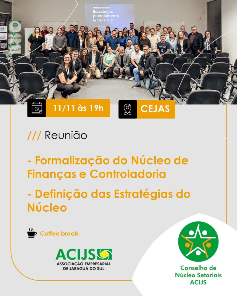 No dia 11, às 19 horas, acontece no CEJAS a reunião de organização do Núcleo de Finanças e Controladoria, o mais novo espaço voltado à integração, fortalecimento e desenvolvimento dos profissionais e empresas da área. Nesta reunião, serão discutidos temas fundamentais para a estruturação do grupo e a presença de gestores destas áreas são bem-vindos para contribuírem. Interessados em participar desta nova jornada do associativismo empresarial podem confirmar presença no encontro acessando o link https://forms.gle/jkksPAfV3x3dhAmH7.