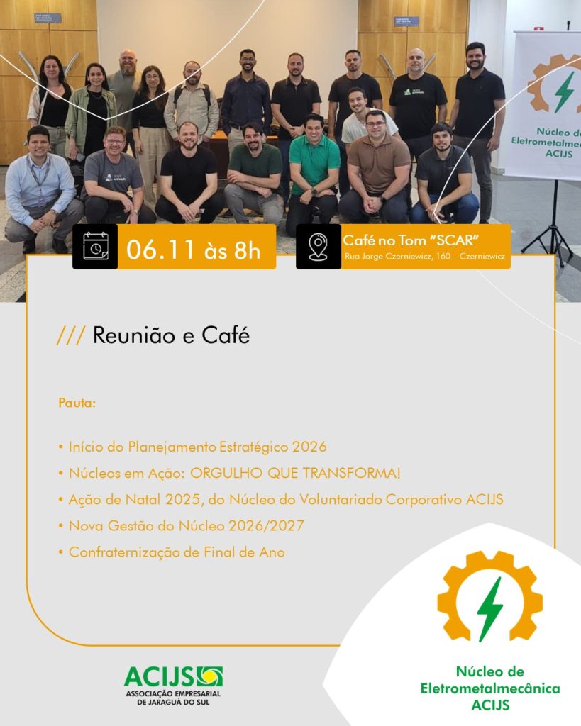 O Núcleo de Eletrometalmecânica realiza encontro no dia 6, às 8h, no Café no Tom. Empresários e colaboradores de empresas interessados em conhecer o núcleo estão convidados a participar.