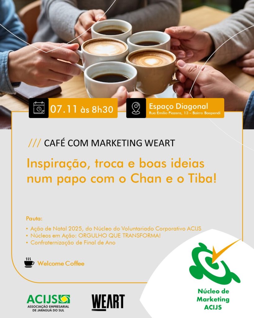 O Núcleo de Marketing realiza um “Café com Marketing” no dia 7 às 8h30. Os nucleados terão um bate-papo Fabiano Chan e Marcelo Tiba Odorizi, da Weart. A ação é gratuita e será realizada no Espaço Diagonal. Empresários e colaboradores de empresas interessados em conhecer o núcleo estão convidados a participar.