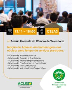 Reconhecimento com moção de aplausos aos Núcleos Empresariais acontece nesta quinta-feira, às 19 horas, no CEJAS. Evento é aberto à comunidade