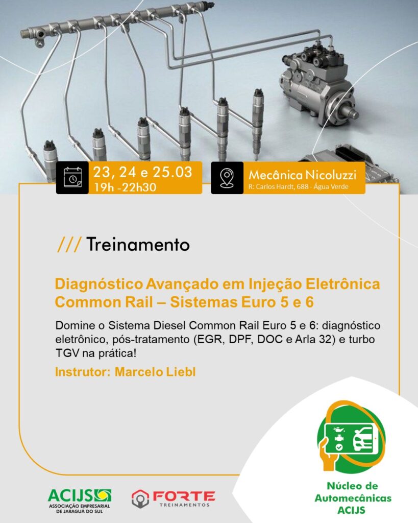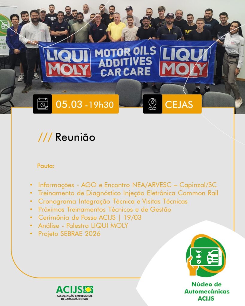 Automecânicas – O Núcleo de Automecânicas realiza reunião de alinhamento das ações no dia 5 de março, às 19h30, no Centro Empresarial de Jaraguá do Sul – CEJAS. Empresas do setor interessadas em conhecer o núcleo estão convidadas a participar. Os nucleados também participam, no período de 23 a 25 de março, de uma capacitação exclusiva que apresentará “Diagnóstico Avançado em Injeção Eletrônica Common Rail – Sistemas Euro 5 e 6”. Mais informações: (47) 99901-6016